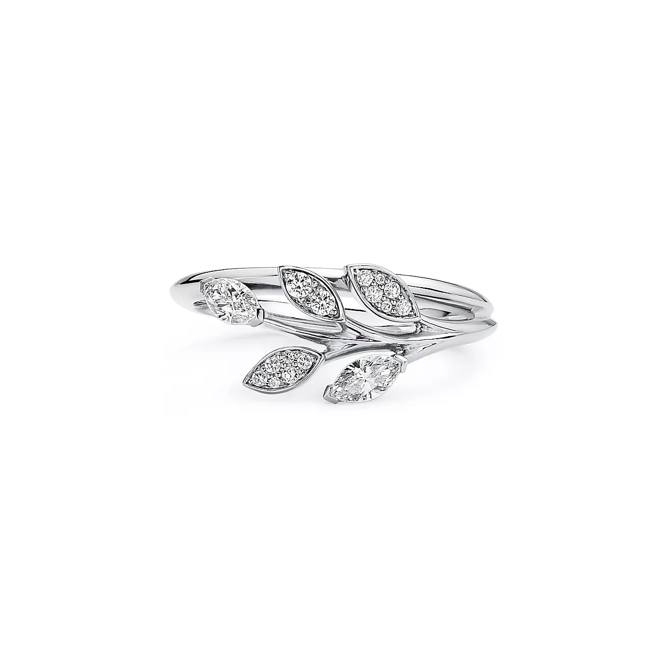 With an intensity that rivals the night sky, Tiffany Victoria celebrates the blazing brilliance of Tiffany diamonds. The organic vine motif of this ring complements the beauty of mixed-cut diamonds.